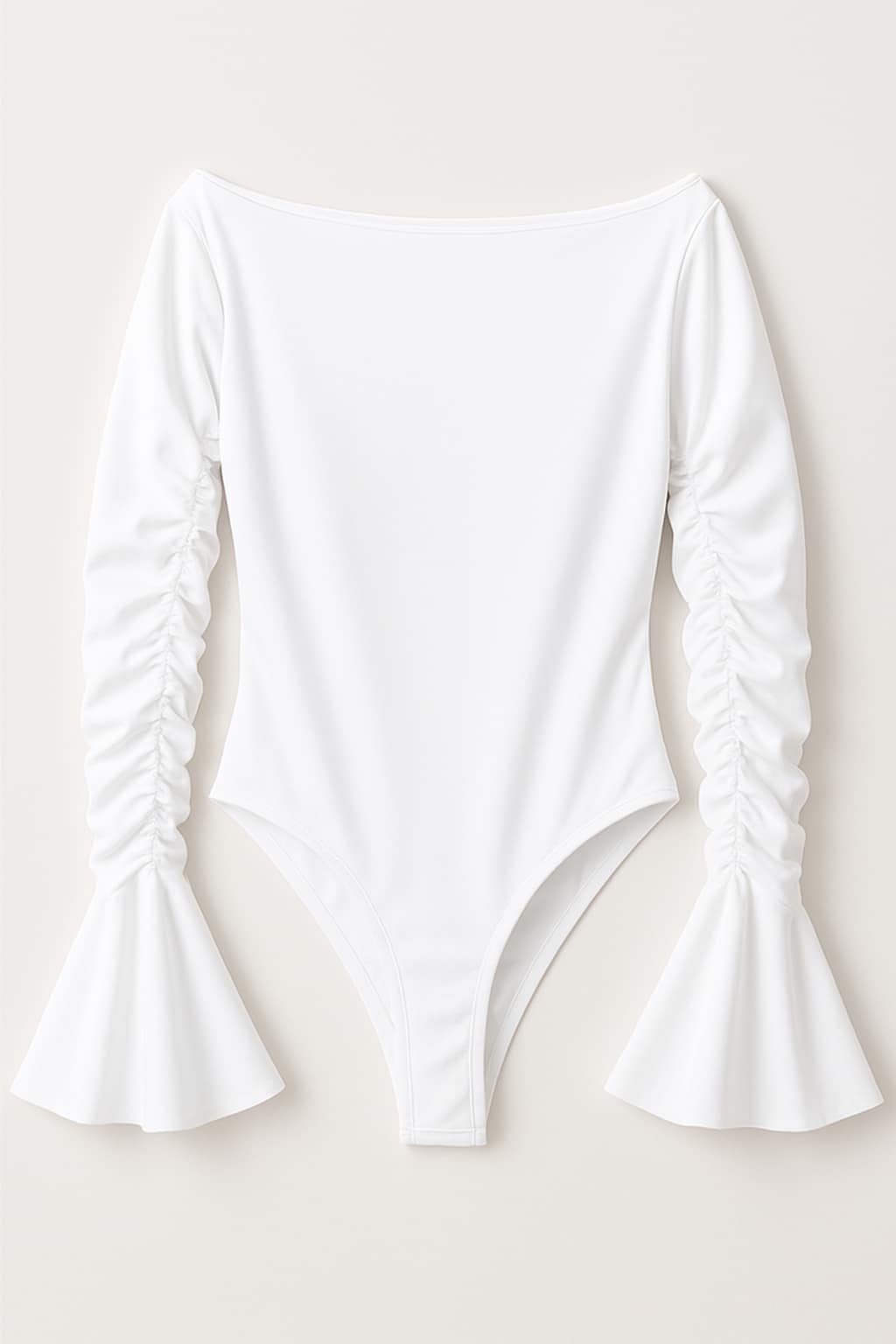 Body bianco elasticizzato con scollo bardot e maniche lunghe arricciate. Femminile, elegante e versatile, perfetto da indossare con jeans o pantaloni a vita alta.