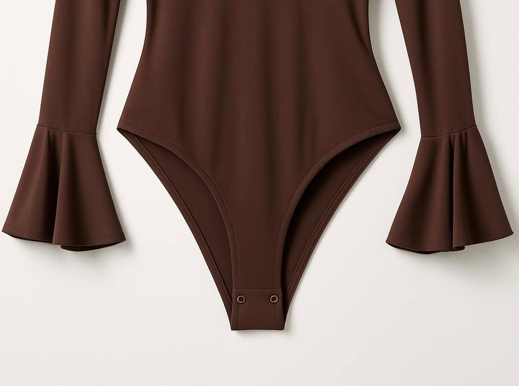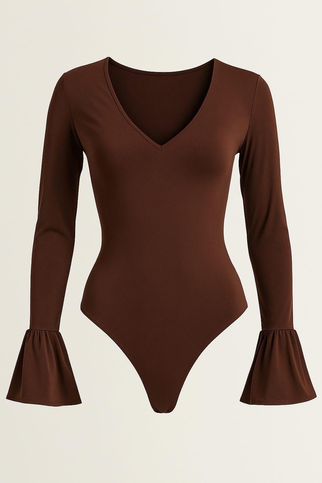 Body marrone elegante con scollo a V e maniche a campana. Tessuto morbido e valorizzante, perfetto con jeans o pantaloni neri. Ideale per ufficio e aperitivo