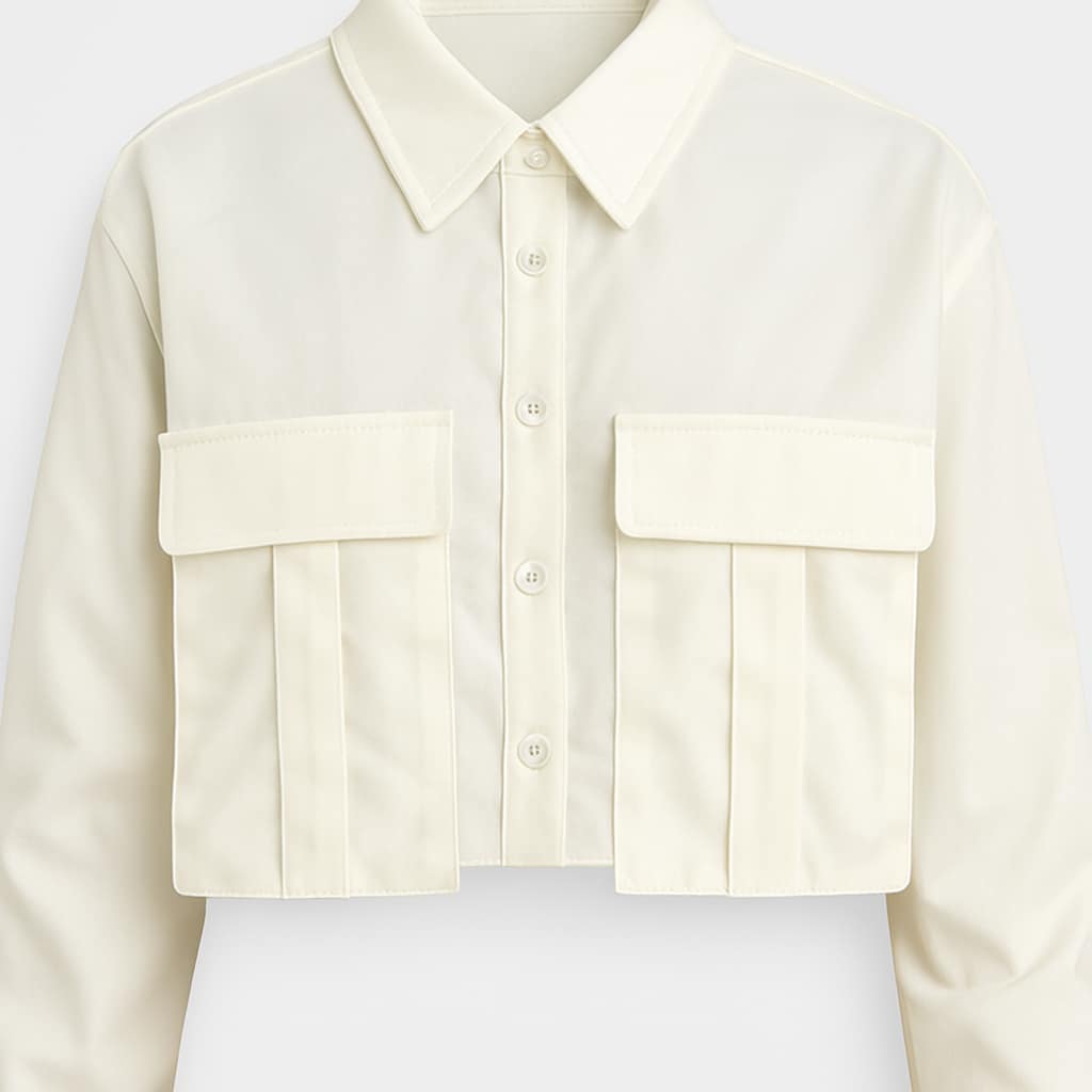 Camicia crop bianca dal taglio moderno, realizzata in tessuto leggero e confortevole. Il modello presenta due tasconi frontali, colletto classico e maniche lunghe con polsino. La vestibilità è morbida sul busto e più corta sul punto vita, perfetta da abbinare a gonne o pantaloni a vita alta per un look fresco e contemporaneo.