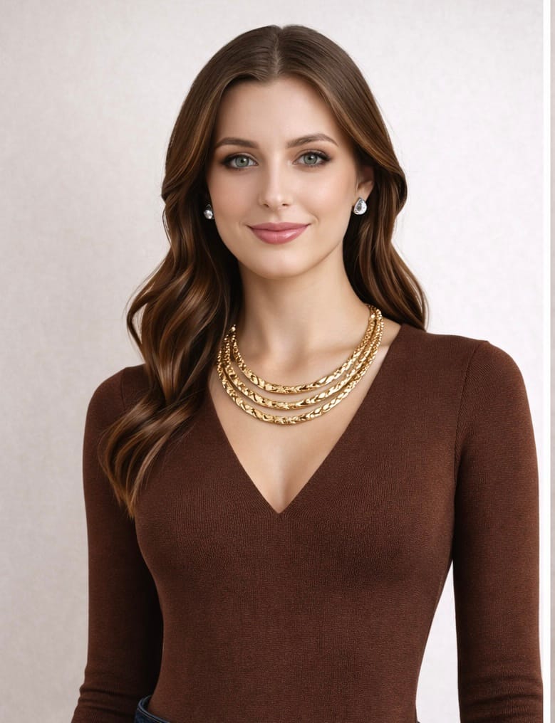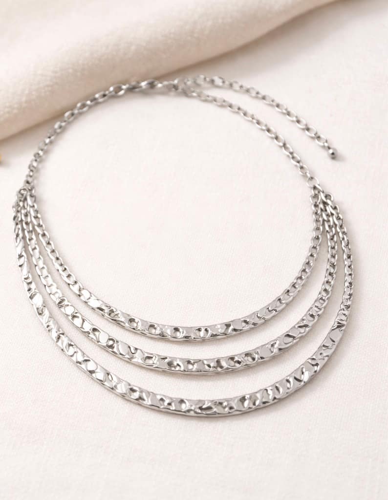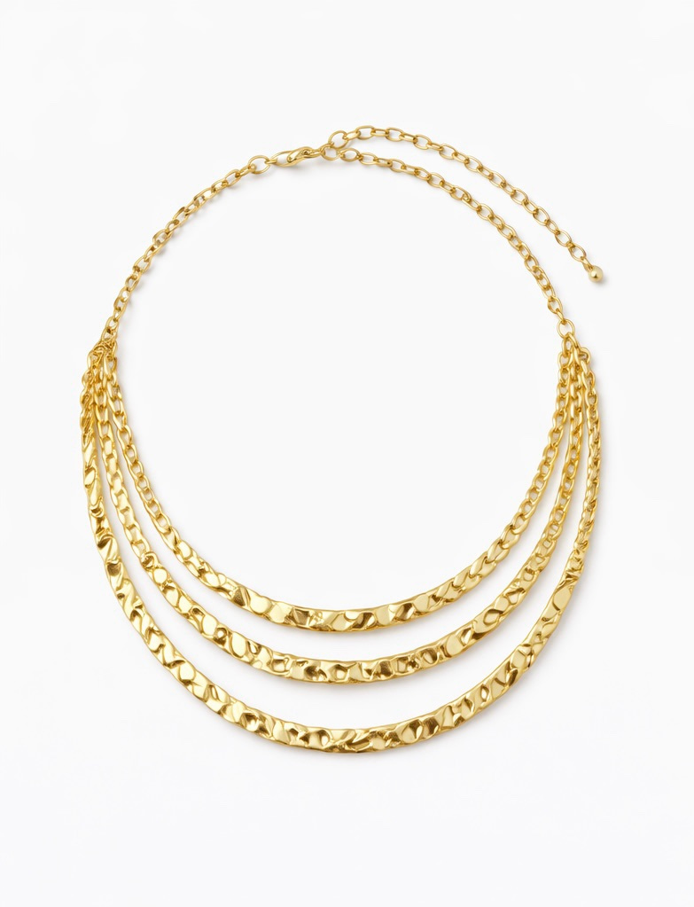 Il design multifilo crea movimento e luce sul décolleté, mentre la finitura martellata dona un effetto raffinato e contemporaneo.
