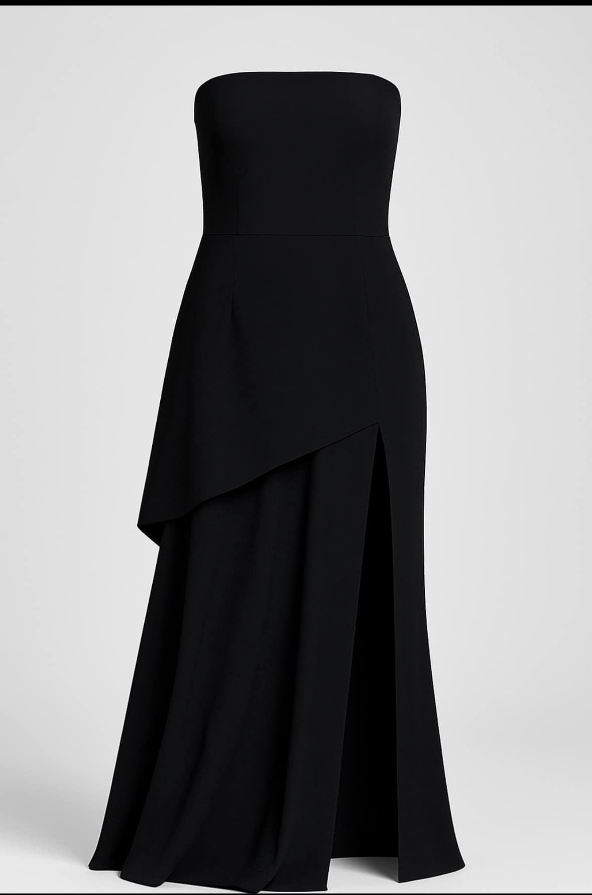 Questo abito lungo nero unisce eleganza e sensualità in un’unica silhouette.