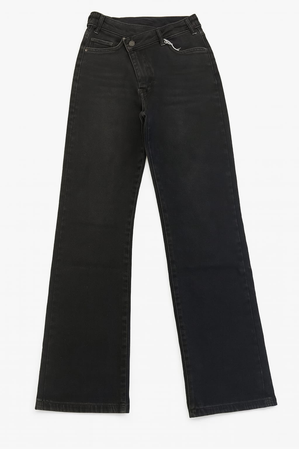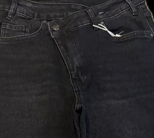 La vita regolare assicura comfort durante tutta la giornata, mentre la particolare chiusura leggermente asimmetrica aggiunge un dettaglio moderno e distintivo. La gamba dritta cade in modo naturale senza stringere, creando una linea pulita che slancia e si adatta a ogni tipo di calzatura: sneakers, stivaletti o tacchi.