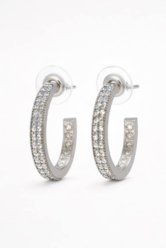 Orecchini a cerchio ovale in finitura argento impreziositi da strass luminosi, perfetti per dare luce al viso e completare qualsiasi look con eleganza.
